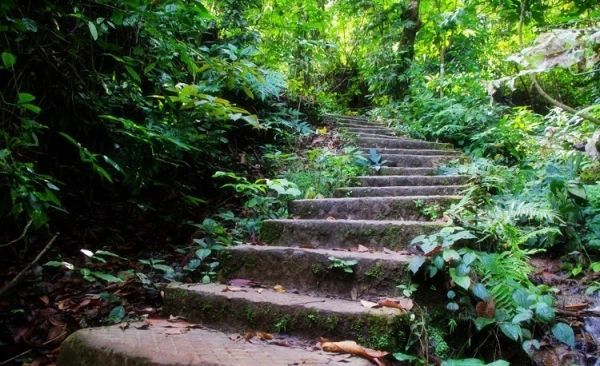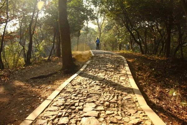 整个老和山健身之路都是由青石板铺成的石阶路,中途没有岔路,整条登山道大约有700级左右的阶梯吧,两旁都是绿树,显得格外的幽静。