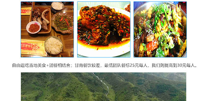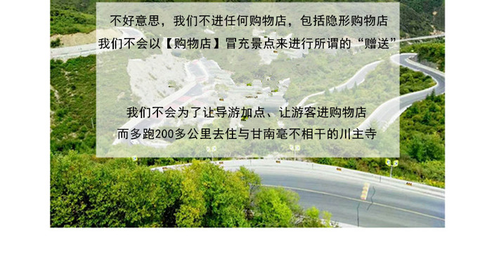 5、因甘南、川北地区条件所限,住宿、餐饮等与发达省份相比存在较大差距;旅游线路景区与景区之间相距较远,如有晕车或其它不舒服者,请提前做好相关准备。有些路段因修路,政府限速,可能造成用餐不准时,请游客提前准备好佐食,并予以理解。