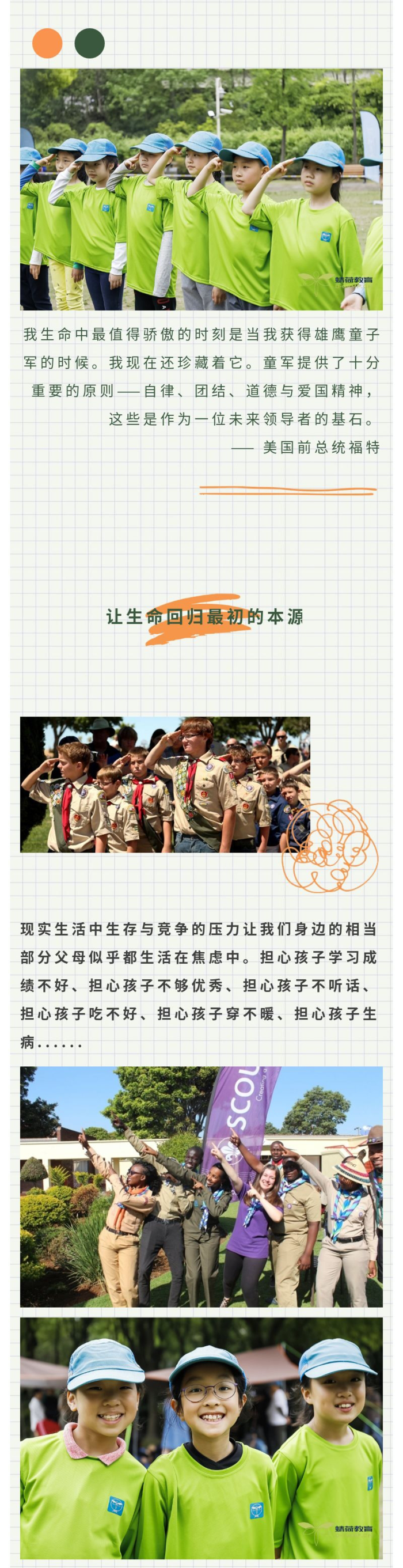 在半日童军体验营活动中,将由多位在世界童军运动组织(WOSM)注册的团长与教练带领孩子们在正规的童军仪式、技能及游戏中切身体会童军诺言与童军规律的真正含义,并教会孩子们终生受用的技能和价值观,让生命回归最初的本源,通过世界童军,创造一个更美好、可持续与和平的世界。