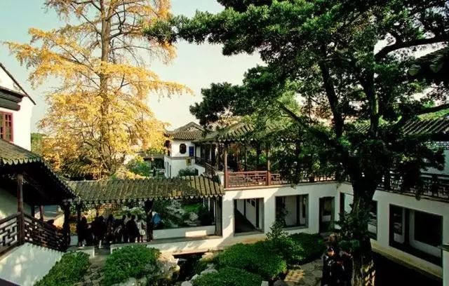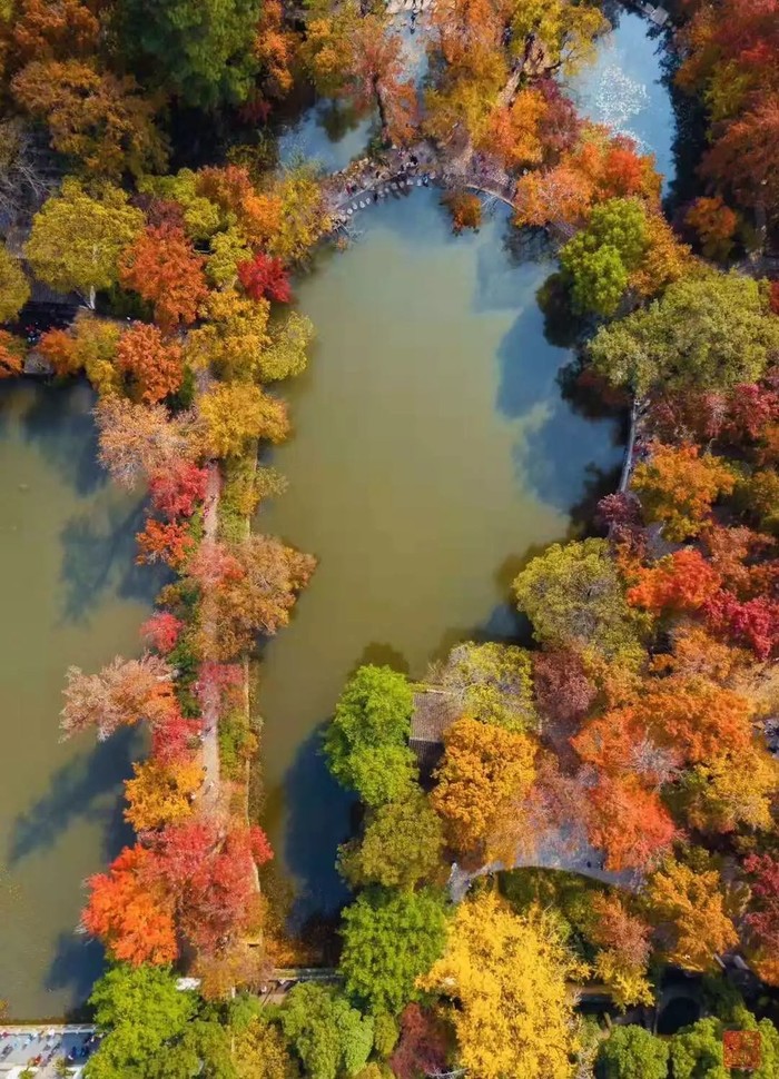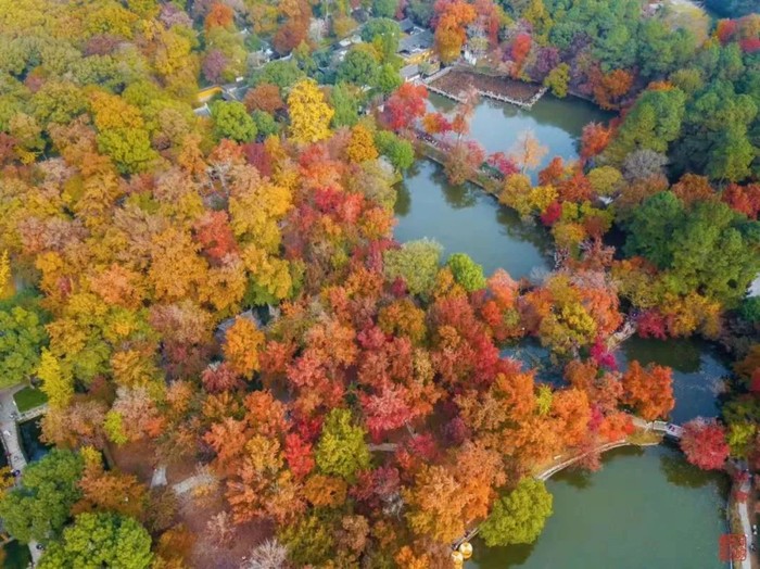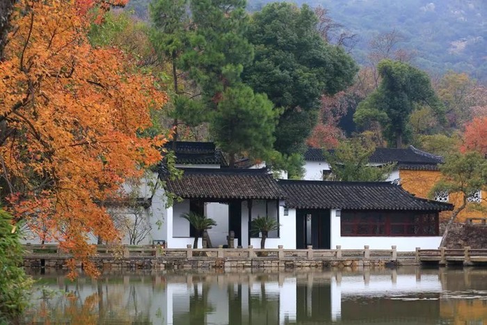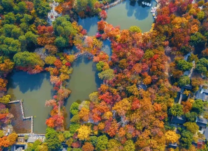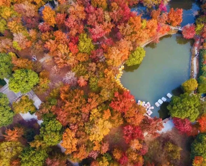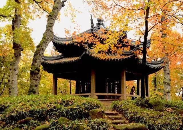 亭台楼榭掩于枫叶之间,露出点点青瓦屋檐,平添诗意。