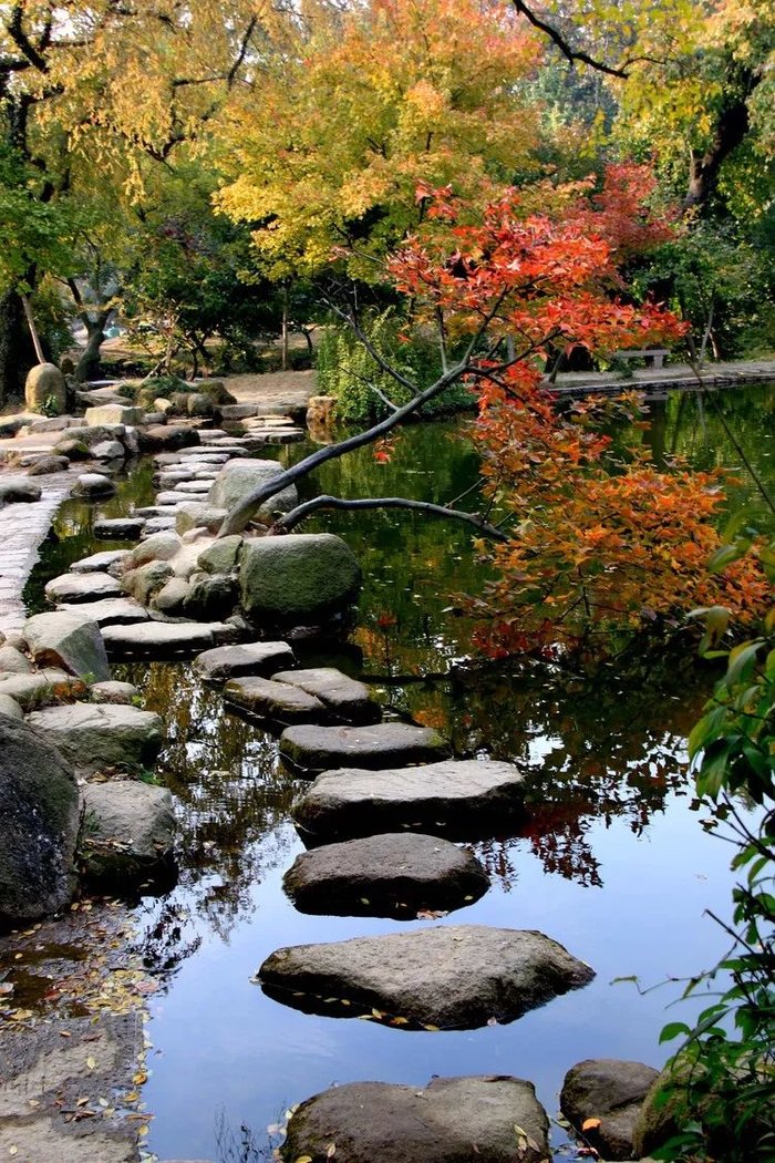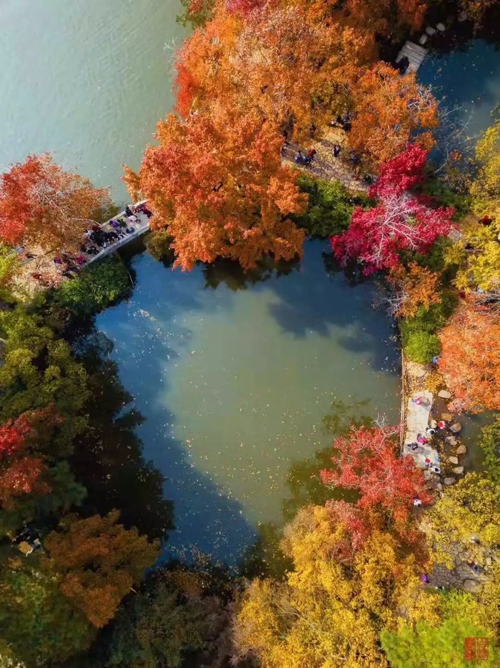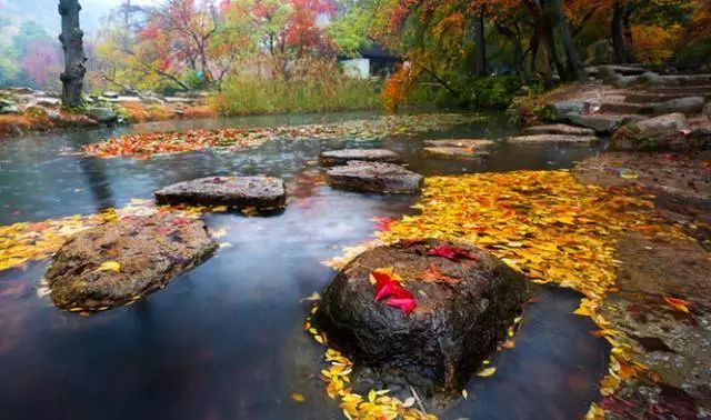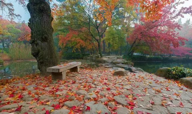 往红枫深处行走,风景最好的地方围绕在几池湖水边。