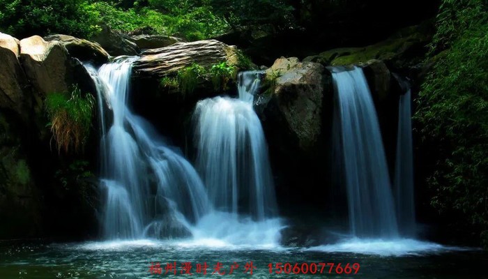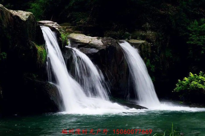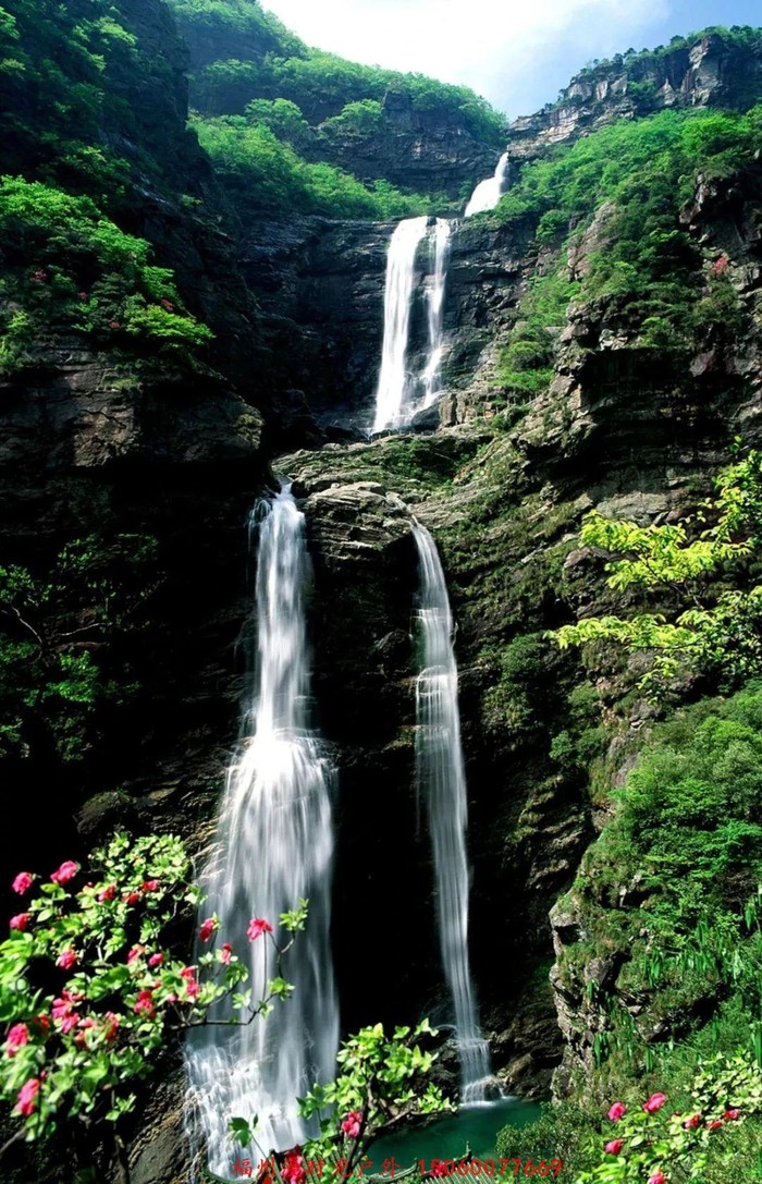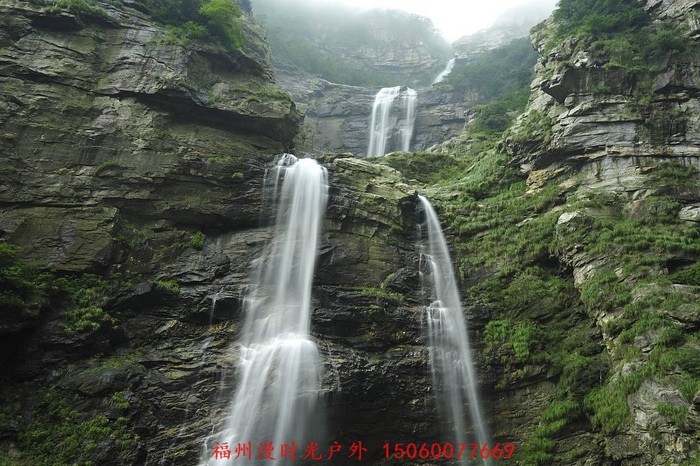 三叠泉瀑布汇集五老峰、大月山诸水,循着天工琢成的三级“冰阶”断崖折叠而下,故名,亦名三级泉、水帘泉。飞瀑流经的峭壁有三级,溪水分三叠泉飞泻而下,落差共155米,极为壮观,撼人魂魄。虽然不见瀑布,但远远就听见雷鸣般的水声。走近瀑布,一挂水幕横空从天空垂下,瀑布源头遥不可望,巨大的水流在自上而下在山崖的两处突起处撞击后又重重的落实入山脚下的一个深潭,水声清脆,仿佛禅乐缥缈。