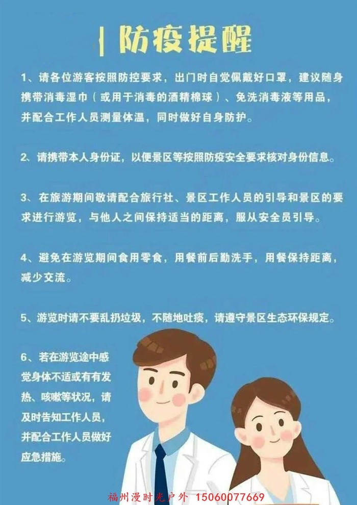 10、 旅游者应确保身体健康,保证自身条件能够完成旅游活动,身体健康状况不佳者请咨询医生是否可以参加本次旅游活动,根据自身情况备好常用药和急救药,因自身疾病而引起的后果游客自行承担责任。