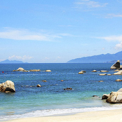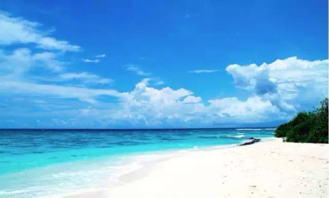 极目远眺,海天一色,海沙洁白晶莹,海水清澈蔚蓝,海礁千姿百态,一切尽收眼底。